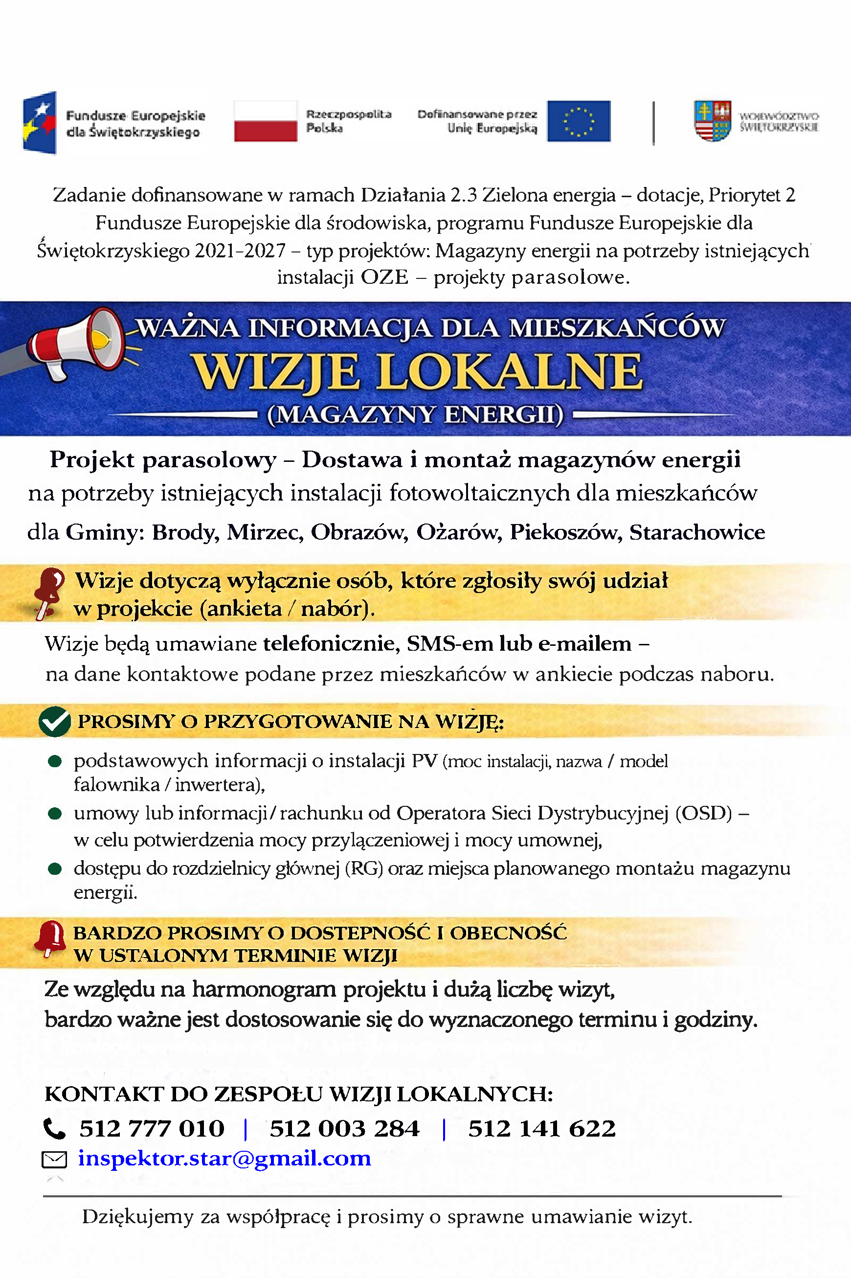 Wizje dotyczą wyłącznie osób, które złożyły ankietę udziału w projekcie. Ze względu na harmonogram przedsięwzięcia oraz dużą liczbę wizyt, bardzo ważna jest dostępność mieszkańców w wyznaczonych terminach.